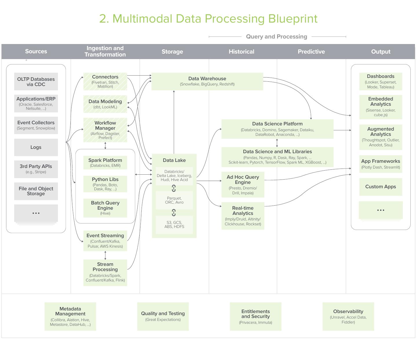 5 . 2. Multimodal Data Processing Blueprint Query and Processing Ingestion and Sources Transformation Storage Historical Predictive Output Connectors Data Warehouse Dashboards OLTP Databases (Looker, Superset, (Fivetran, Stitch, via CDC Matillion) (Snowflake, BigQuery, Redshift) Mode, Tableau) Applications/ERP Embedded (Oracle, Salesforce, Data Modeling Analytics Netsuite, ...) (dbt, LookML) (Sisense, Looker, cube.js) Event Collectors Workflow Data Science Platform (Segment, Snowplow) Manager (Databricks, Domino, Sagemaker, Dataiku, Augmented (Airflow, Dagster, DataRobot, Anaconda, ...) Analytics Prefect) (Thoughtspot, Outlier, Anodot, Sisu) Logs Data Science and ML Libraries (Pandas, Numpy, R, Dask, Ray, Spark, ... Spark Platform Data Lake Scikit-learn, Pytorch, TensorFlow, Spark ML, XGBoost, ...) App Frameworks 3rd Party APIs (Databricks, EMR) (Plotly Dash, Streamlit) (e.g., Stripe) Databricks/ Delta Lake, Iceberg, Ad Hoc Query Python Libs Hudi, Hive Acid (Pandas, Boto, Engine File and Object Dask, Ray, ...) (Presto, Dremio/ Custom Apps Storage Drill, Impala) Parquet, Batch Query ORC, Avro Engine Real-time (Hive) Analytics (Imply/Druid, Altinity/ S3, GCS, Clickhouse, Rockset) ABS, HDFS Event Streaming (Confluent/Kafka, Pulsar, AWS Kinesis) Stream Processing (Databricks/Spark, Confluent/Kafka, Flink) Metadata Management Quality and Testing Entitlements Observability and Security (Unravel, Accel Data, (Collibra, Alation, Hive, (Great Expectations) (Privacera, Immuta) Fiddler) Metastore, DataHub, ...)