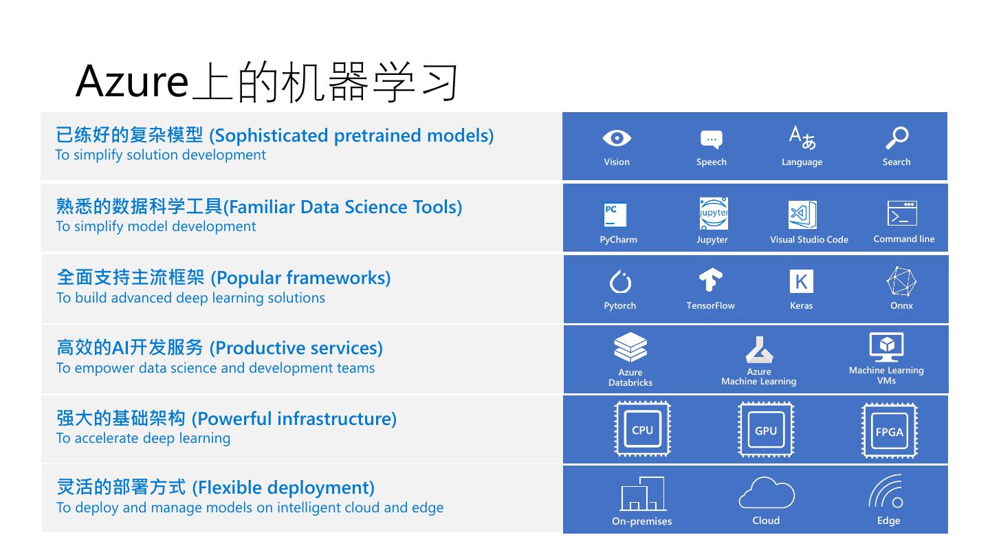 3 . Azure上的机器学习 已练好的复杂模型 (Sophisticated pretrained models) … To simplify solution development Vision Speech Language Search 熟悉的数据科学工具(Familiar Data Science Tools) To simplify model development PyCharm Jupyter Visual Studio Code Command line 全面支持主流框架 (Popular frameworks) To build advanced deep learning solutions Pytorch TensorFlow Keras Onnx 高效的AI开发服务 (Productive services) To empower data science and development teams Azure Azure Machine Learning Databricks Machine Learning VMs 强大的基础架构 (Powerful infrastructure) To accelerate deep learning 灵活的部署方式 (Flexible deployment) To deploy and manage models on intelligent cloud and edge On-premises Cloud Edge