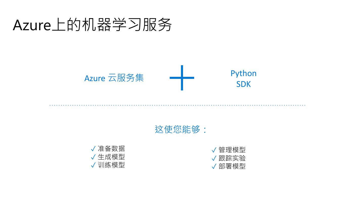 4 .Azure上的机器学习服务 Python Azure 云服务集 SDK 这使您能够: ✓ 准备数据 ✓ 管理模型 ✓ 生成模型 ✓ 跟踪实验 ✓ 训练模型 ✓ 部署模型