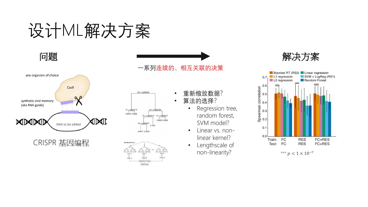 5 .设计ML解决方案 问题 解决方案 一系列连续的、相互关联的决策 • 重新缩放数据? • 算法的选择? • Regression tree, random forest, SVM model? • Linear vs. non- linear kernel? CRISPR 基因编程 • Lengthscale of non-linearity? *** 𝑝 < 1 × 10−7