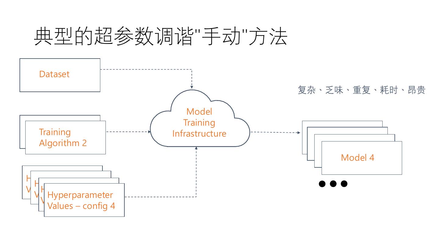 8 . 典型的超参数调谐"手动"方法 Dataset 复杂、乏味、重复、耗时、昂贵 Model Training Training Training Infrastructure Algorithm 1 Model 1 Algorithm 2 Model 2 Model 3 Model 4 Hyperparameter Hyperparameter Hyperparameter Values – config 1 Values – config 2 Hyperparameter Values – config 3 Values – config 4