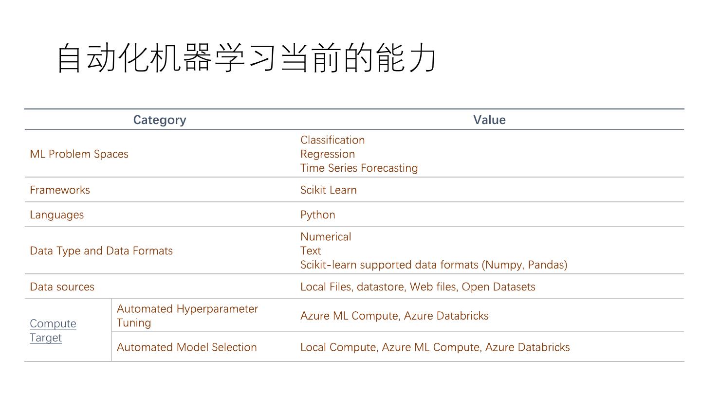 12 . 自动化机器学习当前的能力 Category Value Compute Target