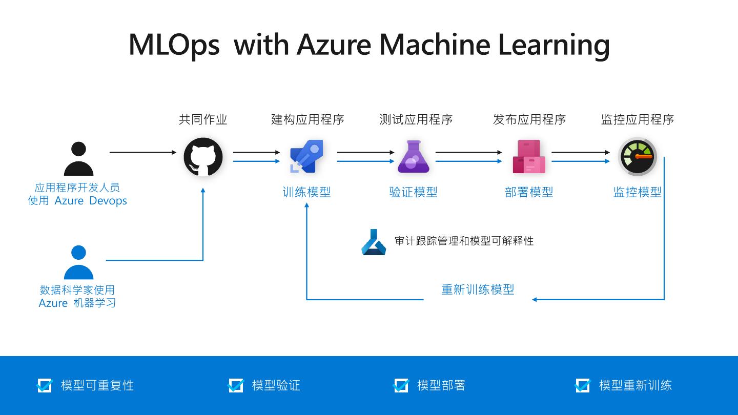 17 . 共同作业 建构应用程序 测试应用程序 发布应用程序 监控应用程序 应用程序开发人员 训练模型 验证模型 部署模型 监控模型 使用 Azure Devops 审计跟踪管理和模型可解释性 数据科学家使用 重新训练模型 Azure 机器学习 模型可重复性 模型验证 模型部署 模型重新训练