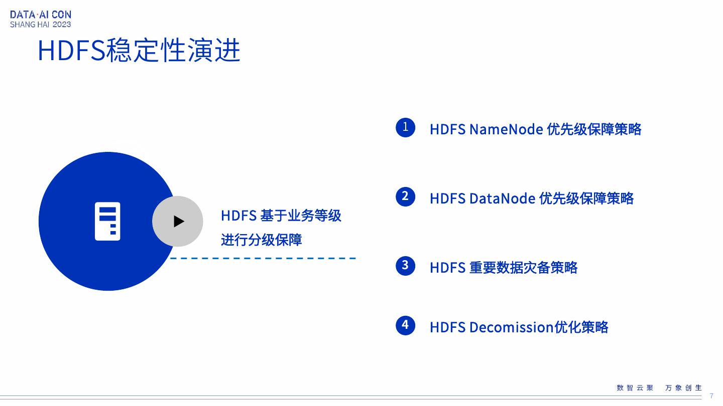 7 .HDFS稳定性演进 1 HDFS NameNode 优先级保障策略 2 HDFS DataNode 优先级保障策略 HDFS 基于业务等级 进行分级保障 3 HDFS 重要数据灾备策略 4 HDFS Decomission优化策略 7