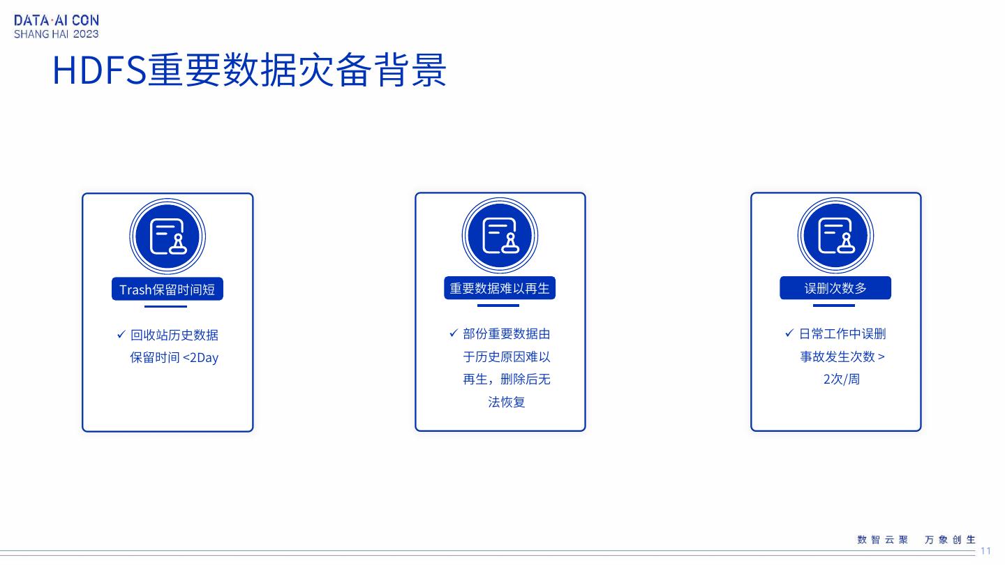 11 .HDFS重要数据灾备背景 Trash保留时间短 重要数据难以再生 误删次数多 回收站历史数据 部份重要数据由 日常工作中误删 保留时间 <2Day 于历史原因难以 事故发生次数 > 再生,删除后无 2次/周 法恢复 11