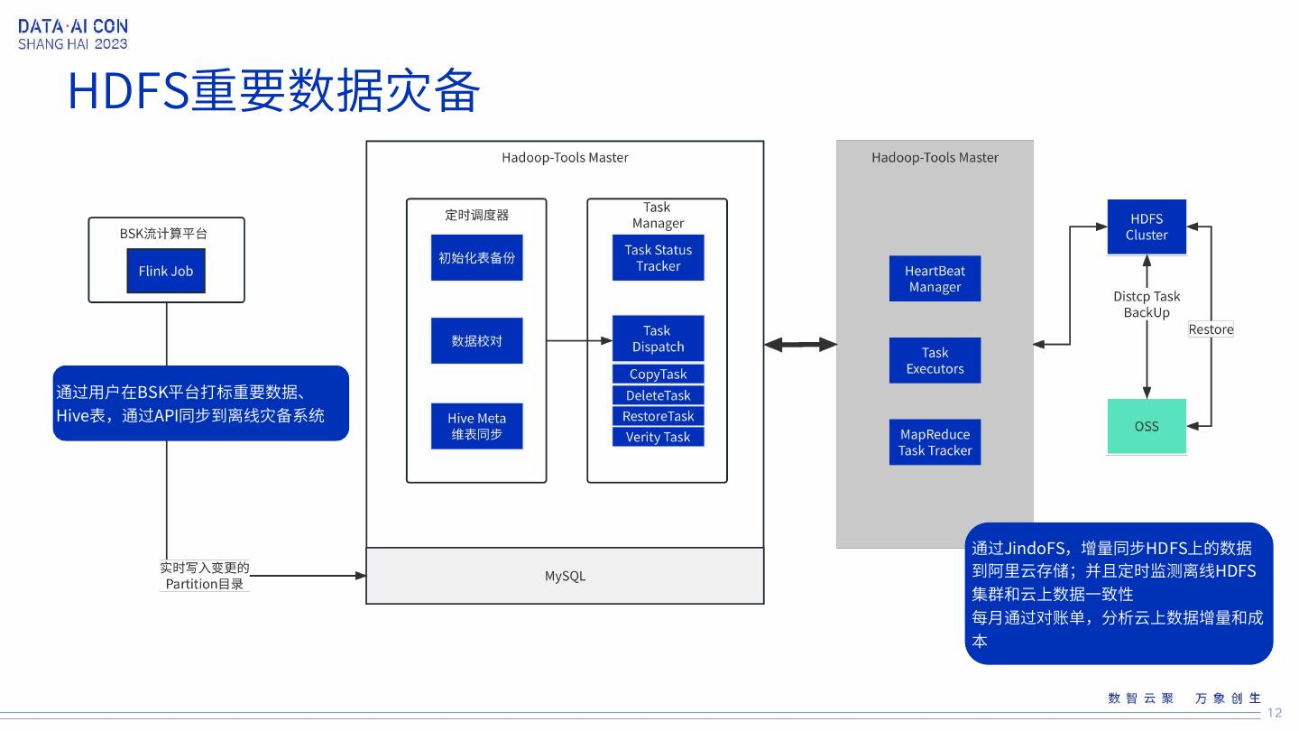 12 .HDFS重要数据灾备 通过用户在BSK平台打标重要数据、 Hive表,通过API同步到离线灾备系统 通过JindoFS,增量同步HDFS上的数据 到阿里云存储;并且定时监测离线HDFS 集群和云上数据一致性 每月通过对账单,分析云上数据增量和成 本 12
