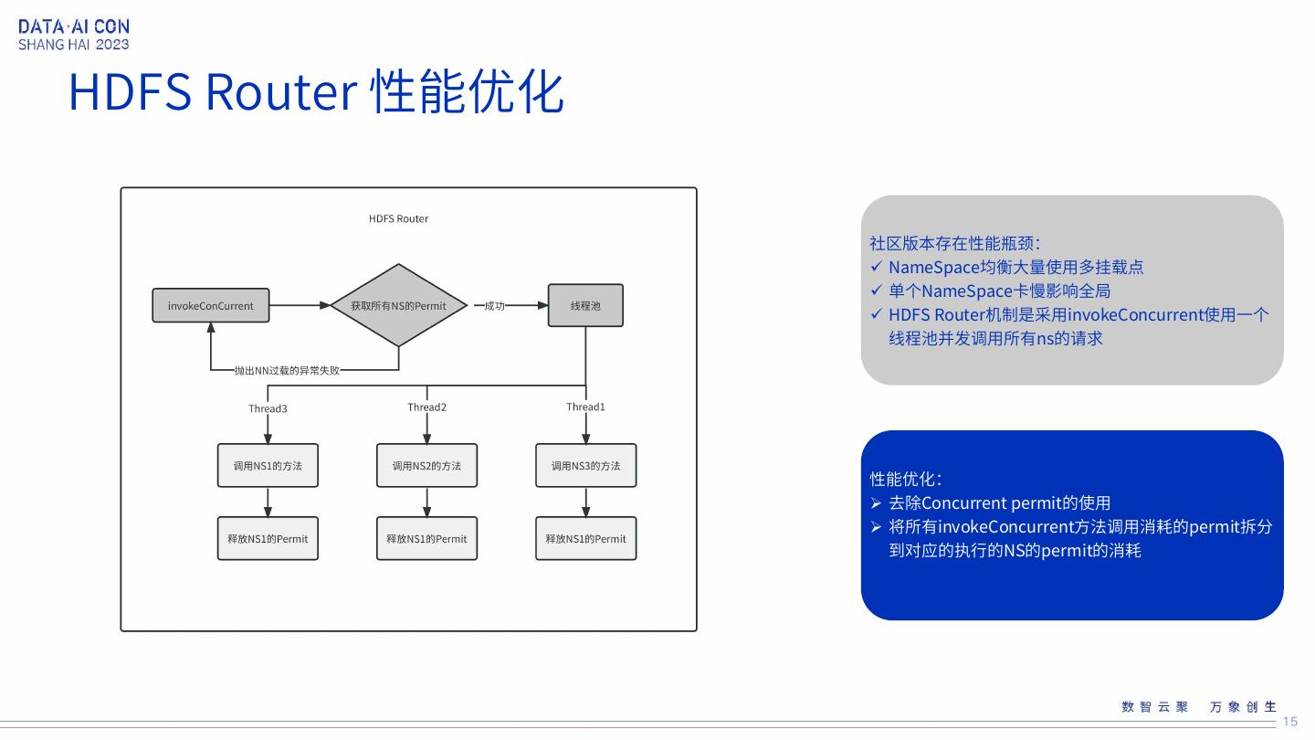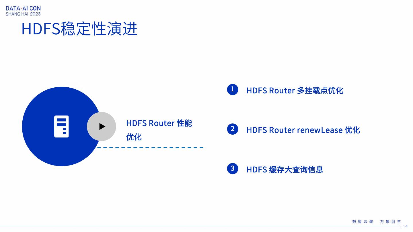 14 .HDFS稳定性演进 1 HDFS Router 多挂载点优化 HDFS Router 性能 2 HDFS Router renewLease 优化 优化 3 HDFS 缓存大查询信息 14