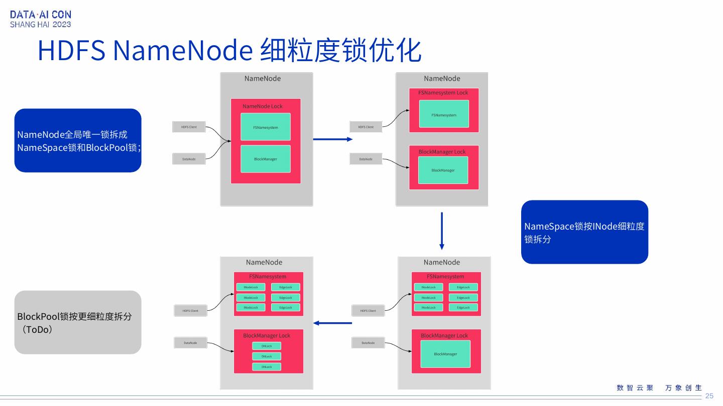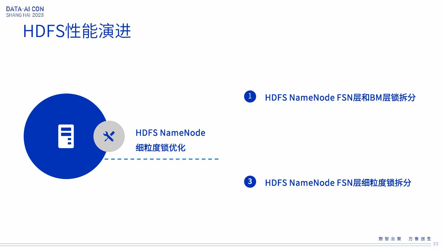 23 .HDFS性能演进 1 HDFS NameNode FSN层和BM层锁拆分 HDFS NameNode 细粒度锁优化 3 HDFS NameNode FSN层细粒度锁拆分 23