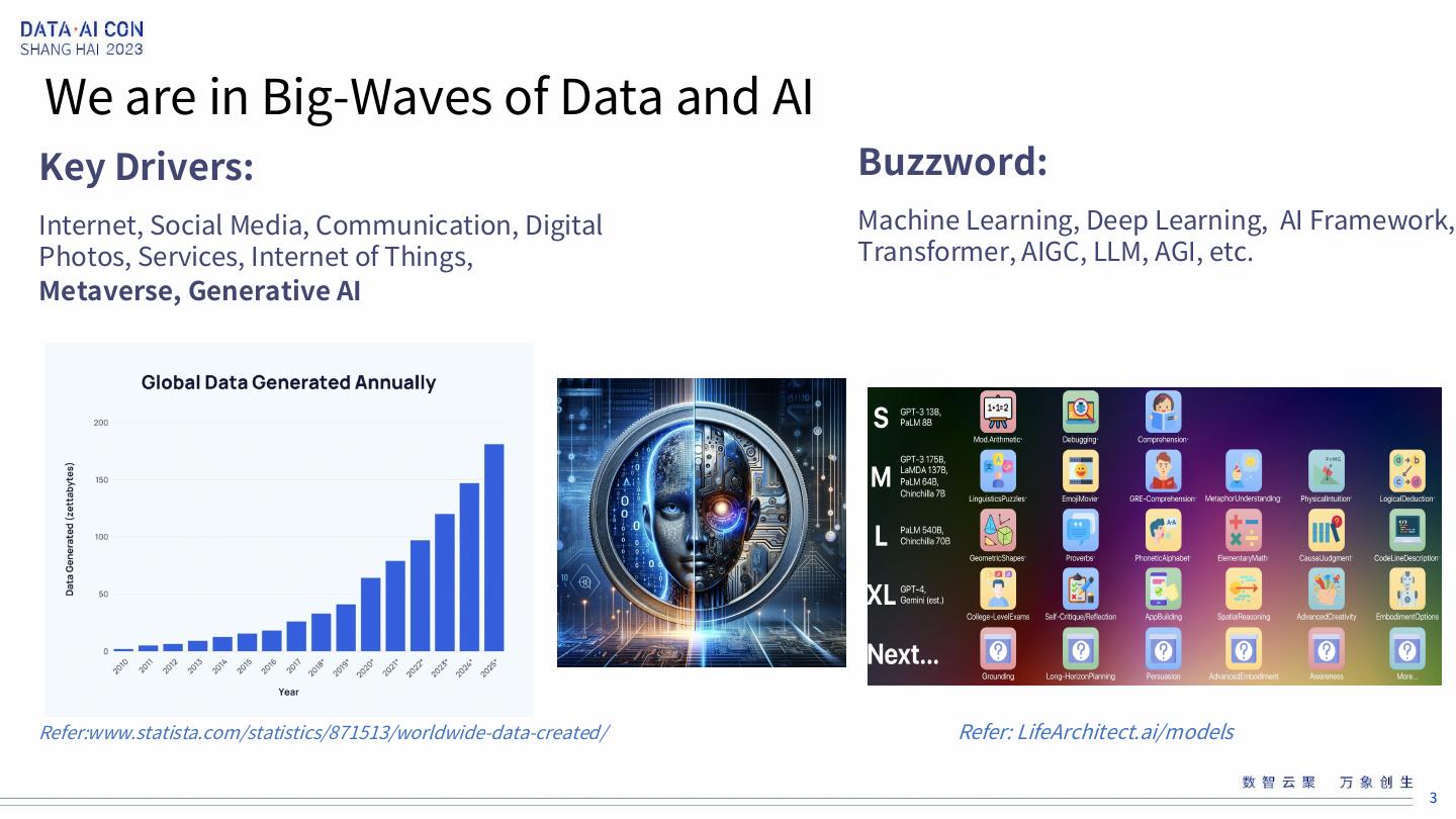 3 .We are in Big-Waves of Data and AI Key Drivers: Buzzword: Internet, Social Media, Communication, Digital Machine Learning, Deep Learning, AI Framework, Photos, Services, Internet of Things, Transformer, AIGC, LLM, AGI, etc. Metaverse, Generative AI Refer:www.statista.com/statistics/871513/worldwide-data-created/ Refer: LifeArchitect.ai/models 3