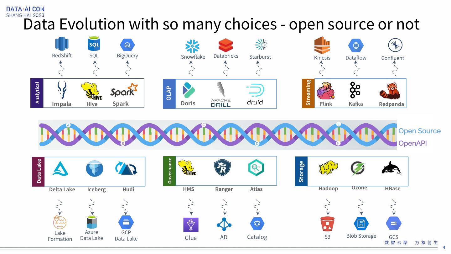 4 .Data Evolution with so many choices - open source or not RedShift SQL BigQuery Snowflake Databricks Starburst Kinesis Dataflow Confluent Streaming Analytical OLAP Impala Hive Spark Doris Flink Kafka Redpanda � � � Open Source � � � OpenAPI Governance Data Lake Storage Delta Lake Iceberg Hudi HMS Ranger Atlas Hadoop Ozone HBase Lake Azure GCP Data Lake Glue AD Catalog S3 Blob Storage GCS Formation Data Lake 4