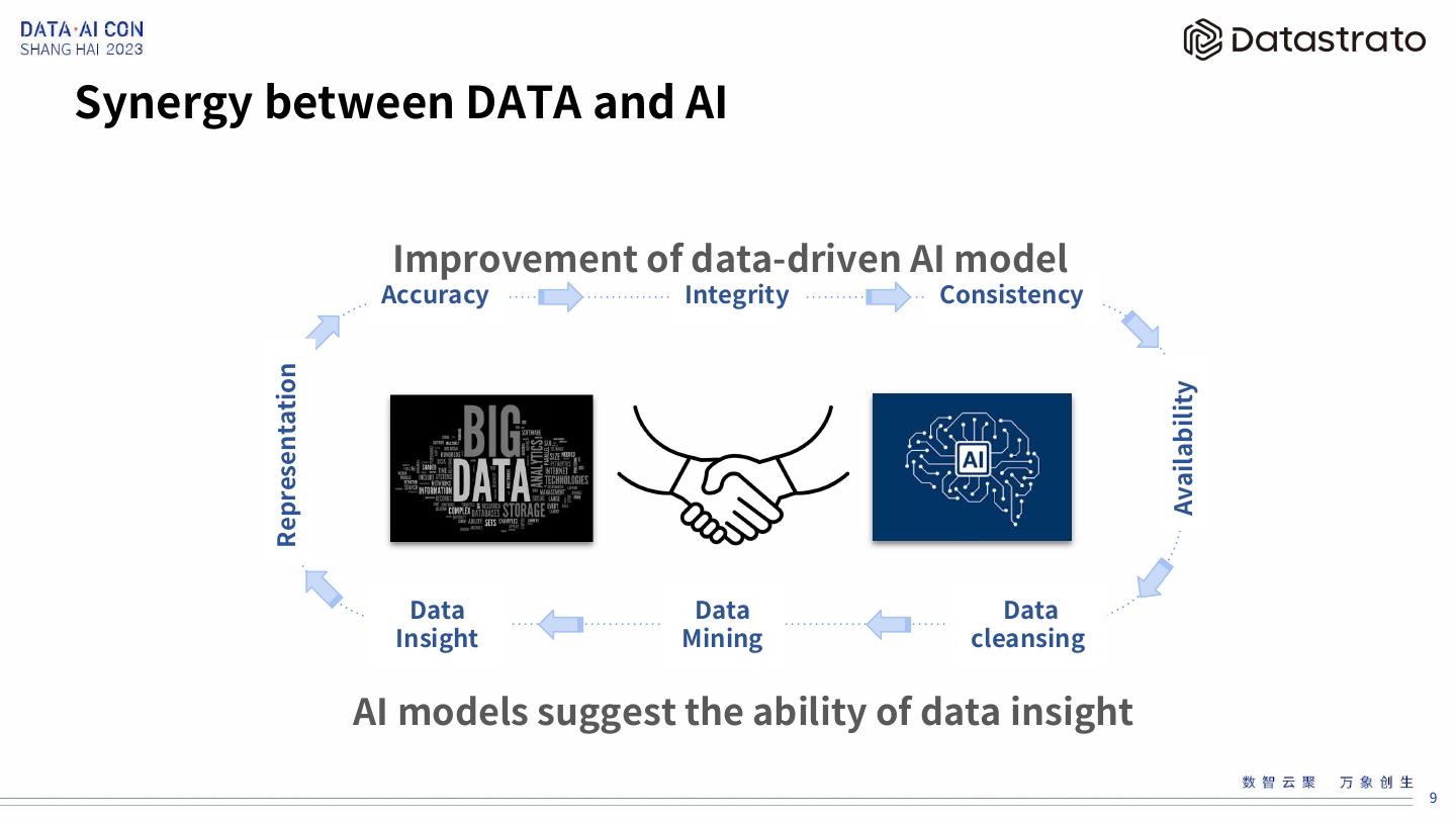 9 .Synergy between DATA and AI Improvement of data-driven AI model Representation Accuracy Integrity Consistency Availability Data Data Data Insight Mining cleansing AI models suggest the ability of data insight 9