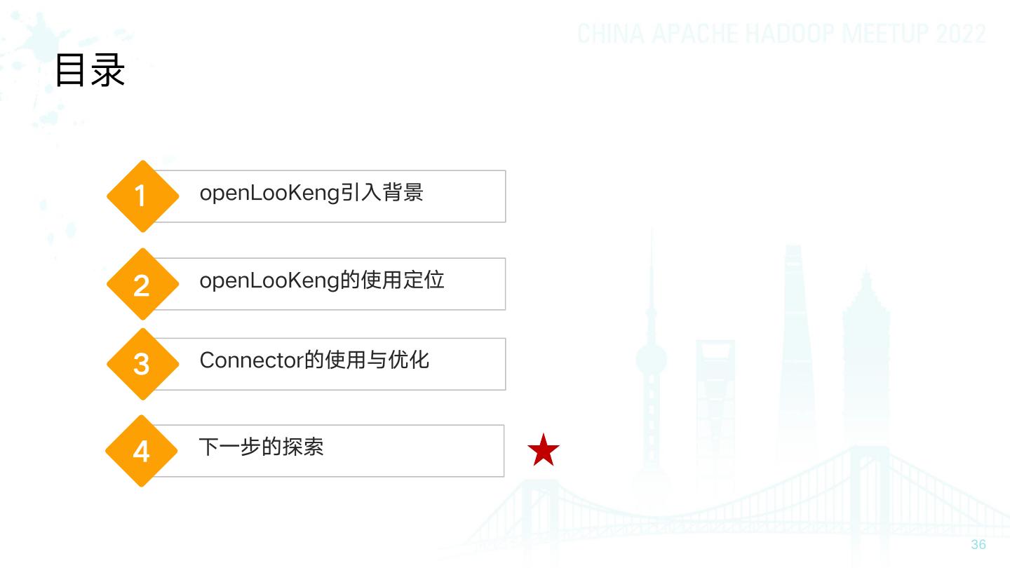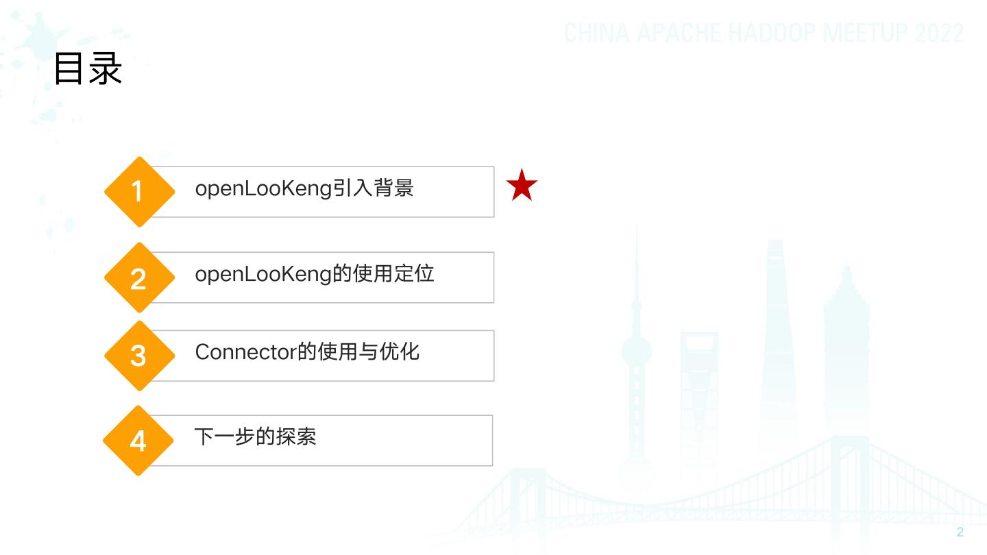 2 .目录 1 openLooKeng引入背景 2 openLooKeng的使用定位 3 Connector的使用与优化 4 下一步的探索 2