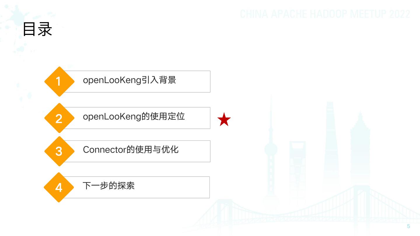 5 .目录 1 openLooKeng引入背景 2 openLooKeng的使用定位 3 Connector的使用与优化 4 下一步的探索 5