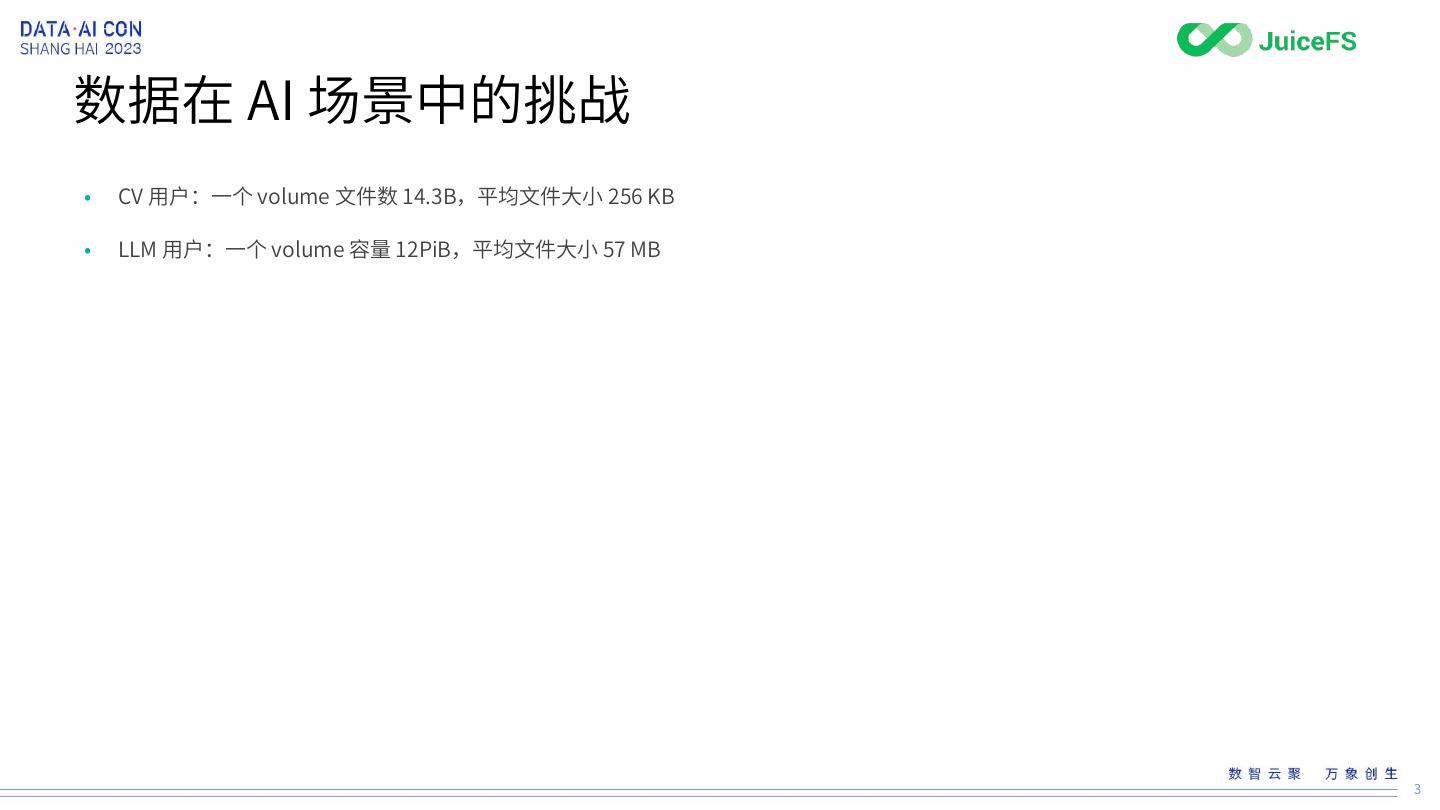 2 .分享内容 • AI 场景中的数据挑战 • 文件存储的发展与选择 • JuiceFS 的设计思路 • 多云上的 AI 训练与数据管理 2