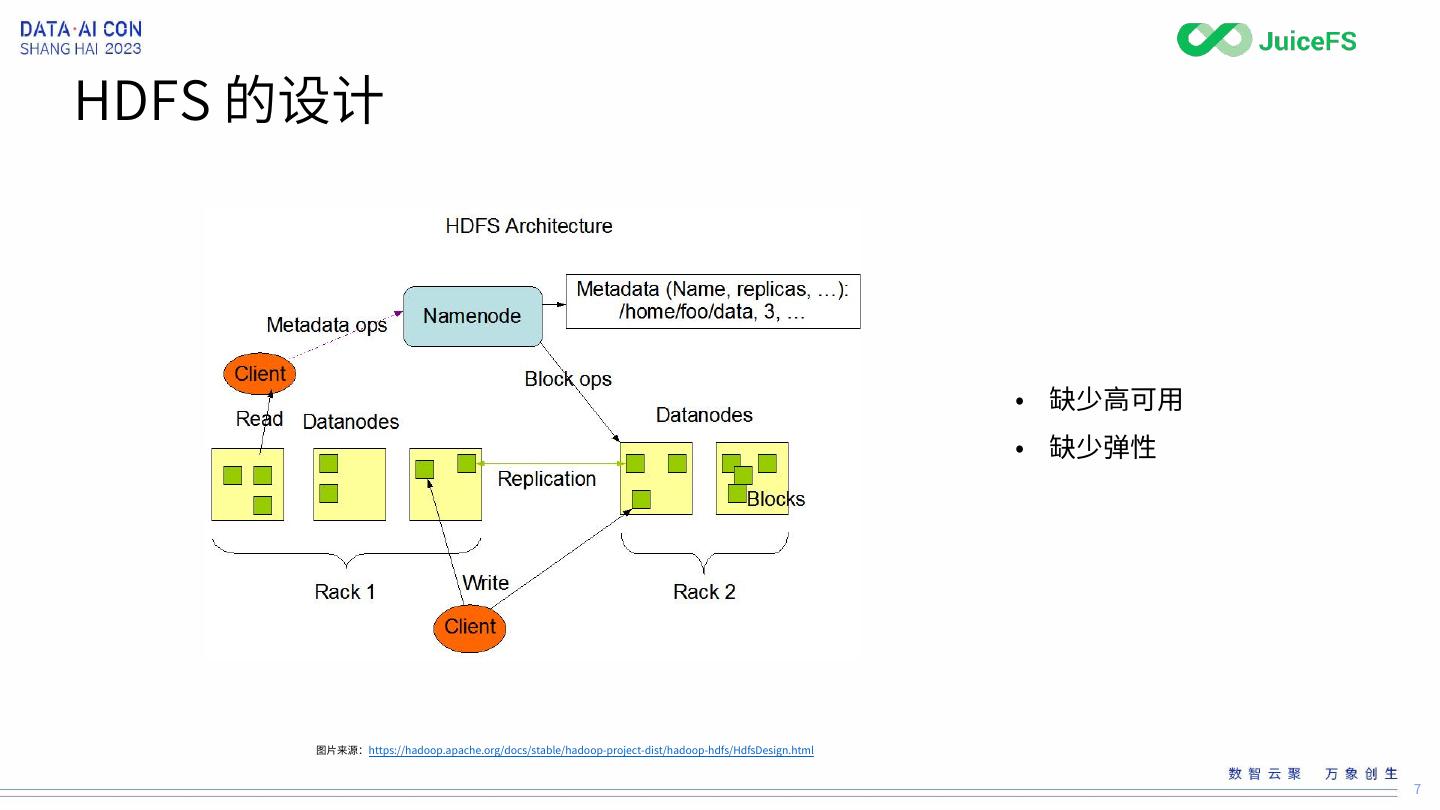 7 .HDFS 的设计 • 缺少高可用 • 缺少弹性 图片来源:https://hadoop.apache.org/docs/stable/hadoop-project-dist/hadoop-hdfs/HdfsDesign.html 7