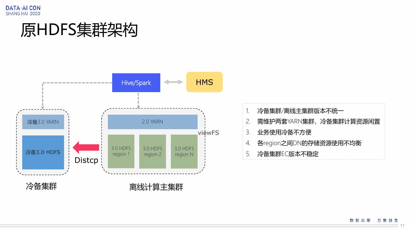11 .原HDFS集群架构 Hive/Spark HMS 1. 冷备集群/离线主集群版本不统一 冷备3.0 YARN 2.0 YARN 2. 需维护两套YARN集群,冷备集群计算资源闲置 viewFS 3. 业务使用冷备不方便 4. 各region之间DN的存储资源使用不均衡 3.0 HDFS 3.0 HDFS 3.0 HDFS 冷备3.0 HDFS region 1 region 2 region N 5. 冷备集群EC版本不稳定 Distcp 冷备集群 离线计算主集群