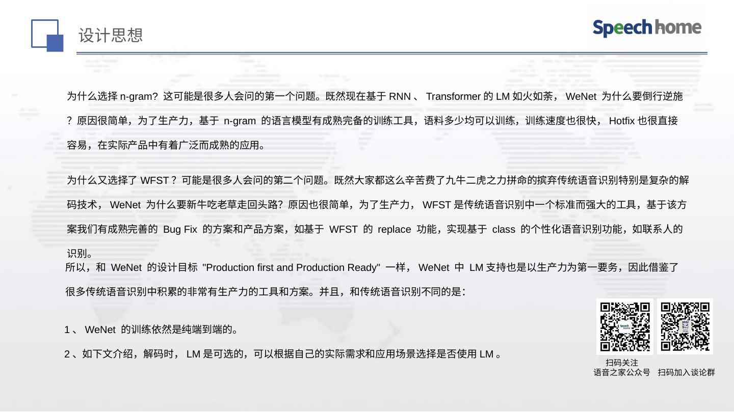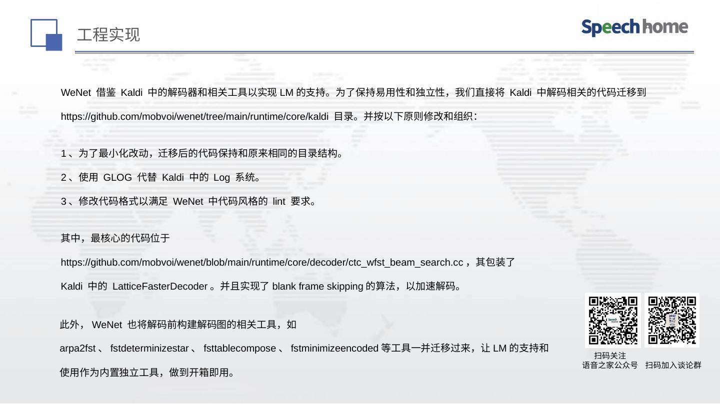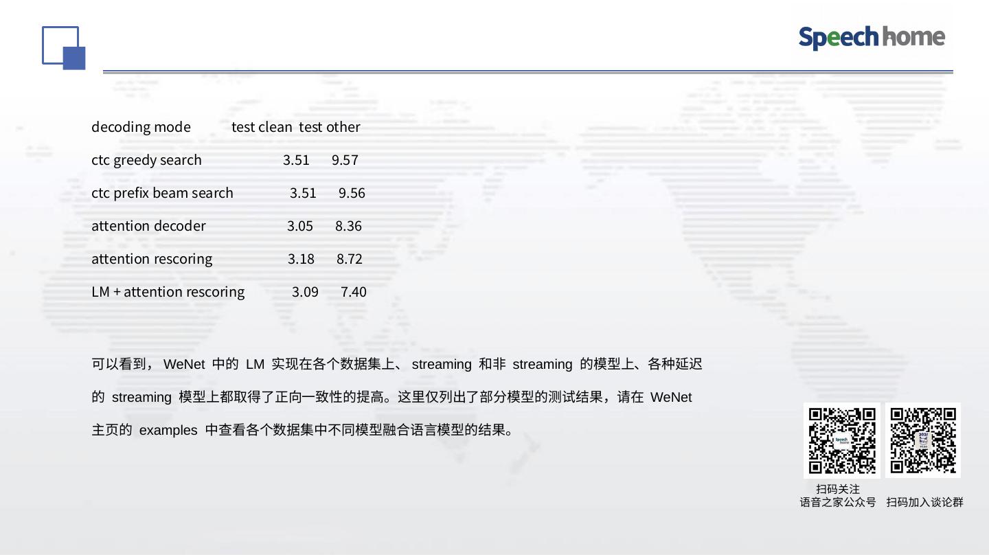 WeNet中选择基于 n-gram 的统计语言模型,结合WFST(Weighted Finite State Transducer)框架和传统语音识别解码技术,实现对定制语言模型的支持。在 AIShell-1, AIShell-2 和 LibriSpeech 三个数据集上,WeNet 的 LM 方案均取得相对错误率3%~10%的下降。
