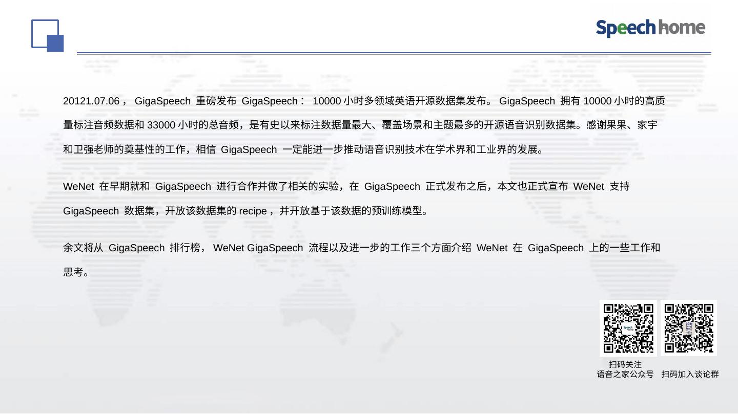GigaSpeech 拥有10000小时的高质量标注音频数据和33000小时的总音频,是有史以来标注数据量最大、覆盖场景和主题最多的开源语音识别数据集。感谢果果、家宇和卫强老师的奠基性的工作,相信 GigaSpeech 一定能进一步推动语音识别技术在学术界和工业界的发展。