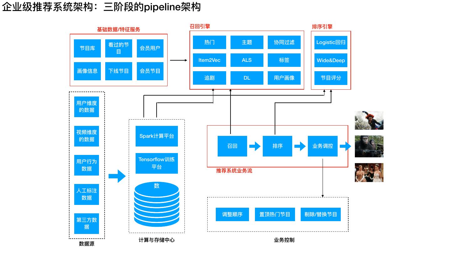 17 .企业级推荐系统架构:三阶段的pipeline架构 召回引擎 排序引擎 基础数据/特征服务 热⻔门 主题 协同过滤 Logistic回归 看过的节 节⽬目库 会员⽤用户 ⽬目 Item2Vec ALS 标签 Wide&Deep 画像信息 下线节⽬目 会员节⽬目 追剧 DL ⽤用户画像 节⽬目评分 ⽤用户维度 的数据 视频维度 Spark计算平台 的数据 召回 排序 业务调控 ⽤用户⾏行行为 Tensorflow训练 数据 平台 推荐系统业务流 数 ⼈人⼯工标注 数据 调整顺序 置顶热⻔门节⽬目 剔除/替换节⽬目 第三⽅方数 据 计算与存储中⼼心 业务控制 数据源