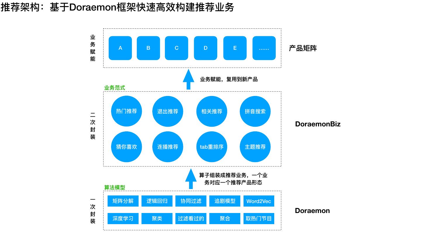20 .推荐架构:基于Doraemon框架快速⾼高效构建推荐业务 业 务 赋 A B C D E …… 产品矩阵 能 业务赋能,复⽤用到新产品 业务范式 热⻔门推荐 退出推荐 相关推荐 拼⾳音搜索 ⼆二 次 DoraemonBiz 封 装 猜你喜欢 连播推荐 tab重排序 主题推荐 算⼦子组装成推荐业务,⼀一个业 务对应⼀一个推荐产品形态 算法模型 ⼀一 矩阵分解 逻辑回归 协同过滤 追剧模型 Word2Vec 次 封 Doraemon 深度学习 聚类 过滤看过的 聚合 取热⻔门节⽬目 装