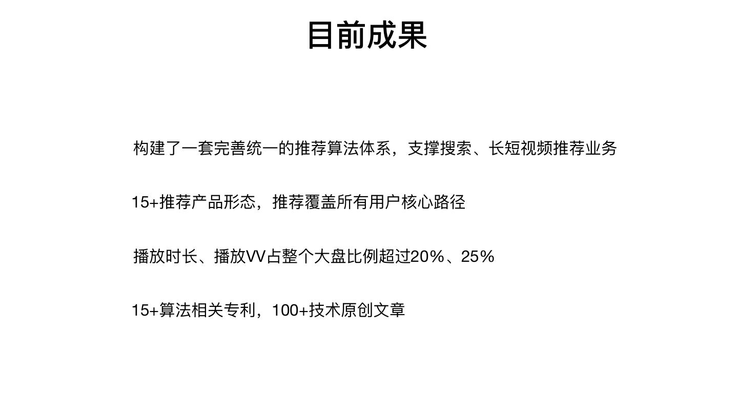 27 . ⽬目前成果 构建了了⼀一套完善统⼀一的推荐算法体系,⽀支撑搜索、⻓长短视频推荐业务 15+推荐产品形态,推荐覆盖所有⽤用户核⼼心路路径 播放时⻓长、播放VV占整个⼤大盘⽐比例例超过20%、25% 15+算法相关专利利,100+技术原创⽂文章