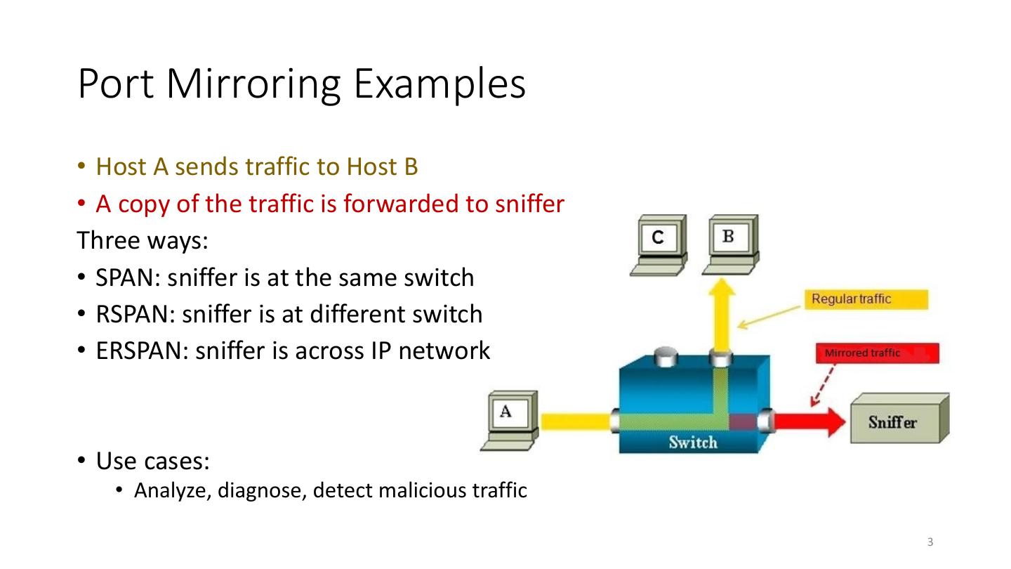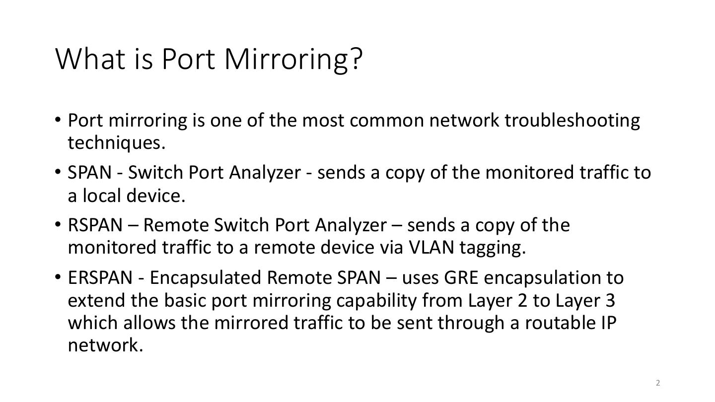 2 .What is Port Mirroring? • Port mirroring is one of the most common network troubleshooting techniques. • SPAN - Switch Port Analyzer - sends a copy of the monitored traffic to a local device. • RSPAN – Remote Switch Port Analyzer – sends a copy of the monitored traffic to a remote device via VLAN tagging. • ERSPAN - Encapsulated Remote SPAN – uses GRE encapsulation to extend the basic port mirroring capability from Layer 2 to Layer 3 which allows the mirrored traffic to be sent through a routable IP network. 2