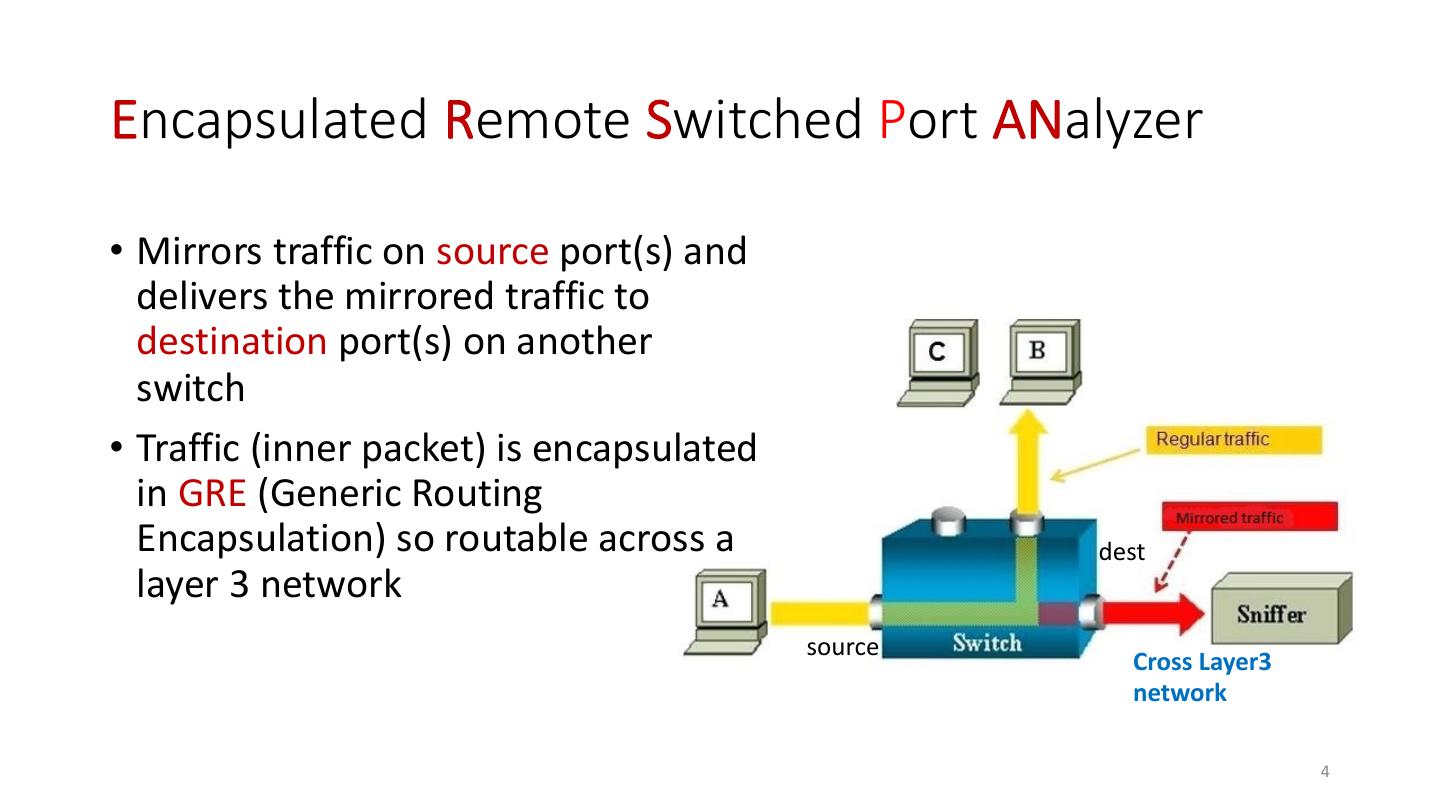 3 .Port Mirroring Examples • Host A sends traffic to Host B • A copy of the traffic is forwarded to sniffer Three ways: • SPAN: sniffer is at the same switch • RSPAN: sniffer is at different switch • ERSPAN: sniffer is across IP network • Use cases: • Analyze, diagnose, detect malicious traffic 3