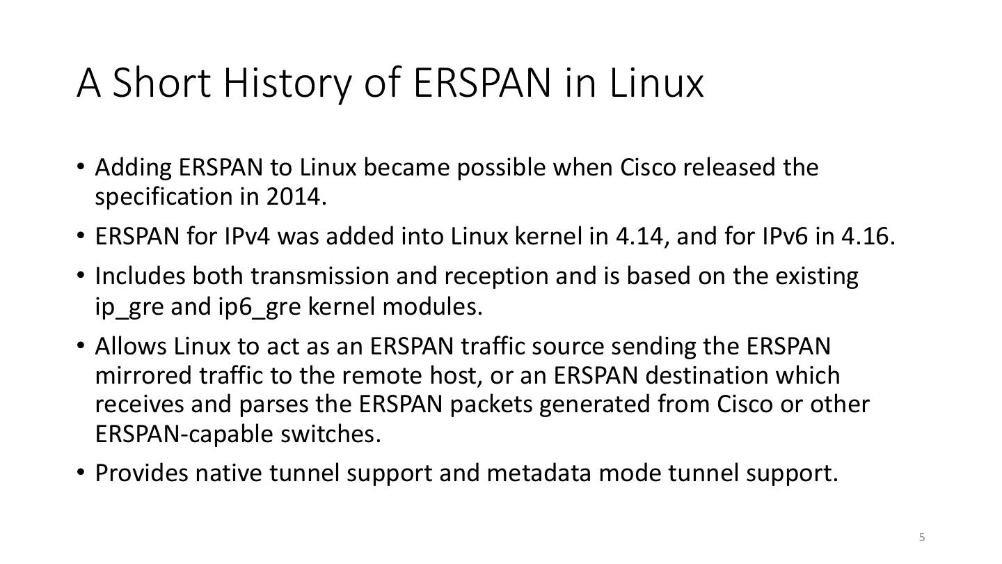5 .A Short History of ERSPAN in Linux • Adding ERSPAN to Linux became possible when Cisco released the specification in 2014. • ERSPAN for IPv4 was added into Linux kernel in 4.14, and for IPv6 in 4.16. • Includes both transmission and reception and is based on the existing ip_gre and ip6_gre kernel modules. • Allows Linux to act as an ERSPAN traffic source sending the ERSPAN mirrored traffic to the remote host, or an ERSPAN destination which receives and parses the ERSPAN packets generated from Cisco or other ERSPAN-capable switches. • Provides native tunnel support and metadata mode tunnel support. 5