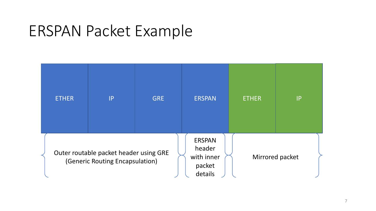 6 .Common ERSPAN Use Cases • Debugging network issues by tracking the control and data frames. • Monitoring Voice-over-IP, VoIP, packets for delay and jitter analysis • Monitoring network transactions for latency analysis • Monitoring network traffic for anomaly detection 6