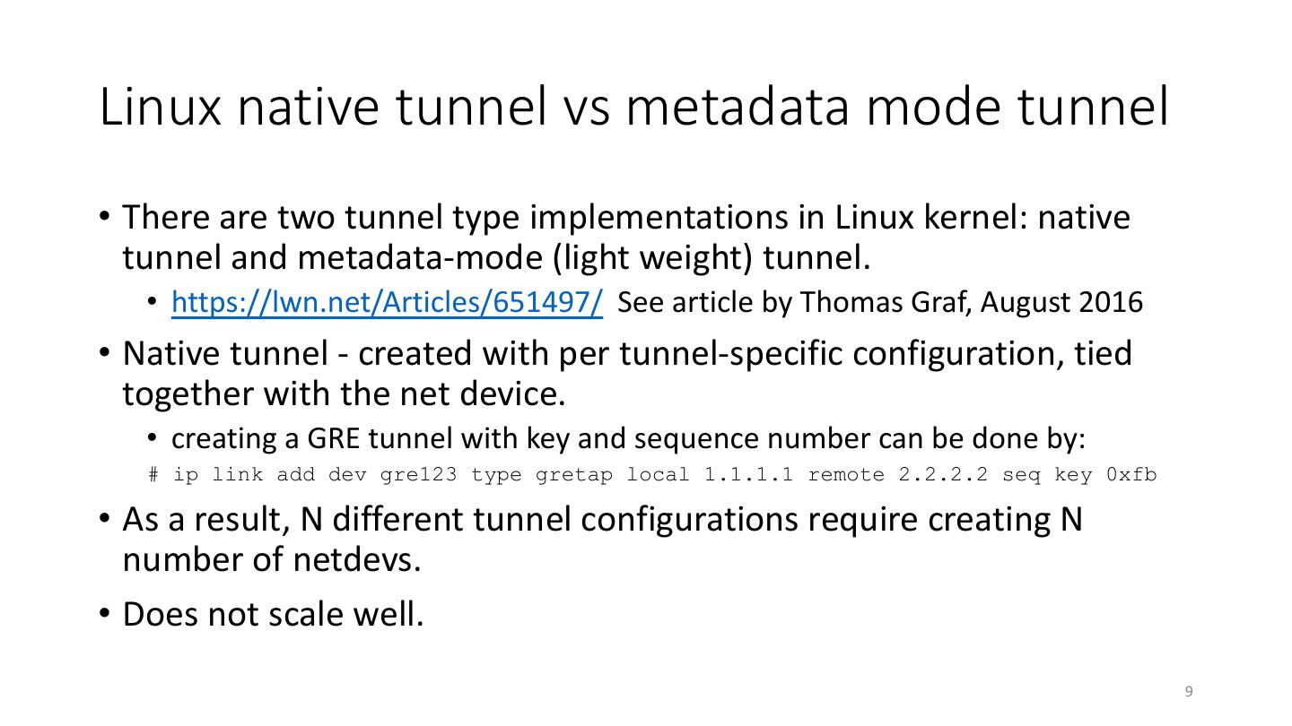 9 .Linux native tunnel vs metadata mode tunnel • There are two tunnel type implementations in Linux kernel: native tunnel and metadata-mode (light weight) tunnel. • https://lwn.net/Articles/651497/ See article by Thomas Graf, August 2016 • Native tunnel - created with per tunnel-specific configuration, tied together with the net device. • creating a GRE tunnel with key and sequence number can be done by: # ip link add dev gre123 type gretap local 1.1.1.1 remote 2.2.2.2 seq key 0xfb • As a result, N different tunnel configurations require creating N number of netdevs. • Does not scale well. 9