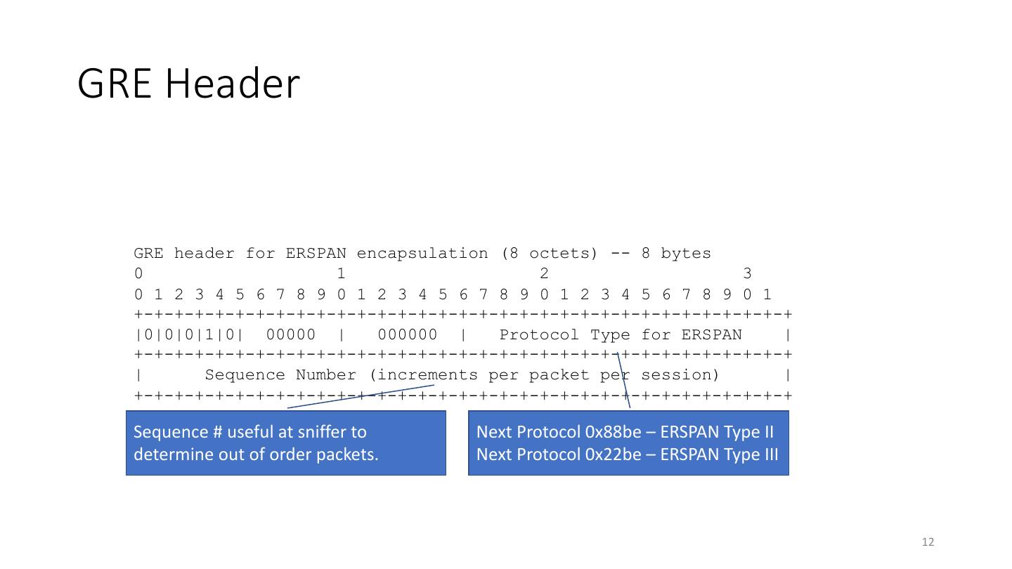 11 . ERSPAN Protocol Headers outer inner ETHER IP GRE ERSPAN ETHER IP The use of the IP protocol as part of the outer header is important Fixed 8 byte header with Seq # because it makes the mirrored Next Protocol 0x88be – ERSPAN Type II traffic routable across any IP Next Protocol 0x22be – ERSPAN Type III network. 11