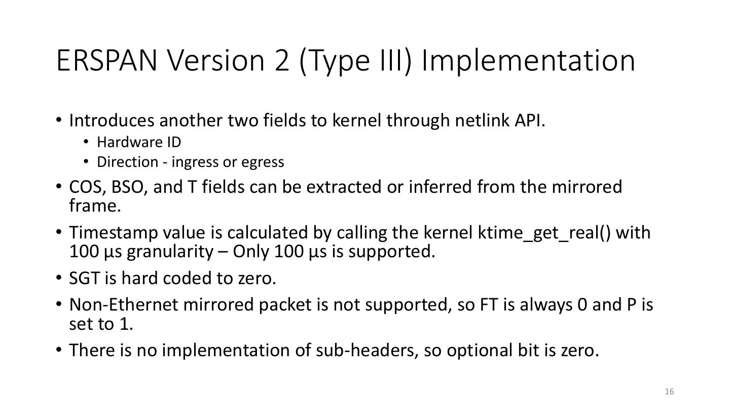 15 .ERSPAN Header – Version 2 (Type III) Bad/Short ERSPAN Version 2 (Type III) header (12 octets) Oversized 0 1 2 3 0 1 2 3 4 5 6 7 8 9 0 1 2 3 4 5 6 7 8 9 0 1 2 3 4 5 6 7 8 9 0 1 +-+-+-+-+-+-+-+-+-+-+-+-+-+-+-+-+-+-+-+-+-+-+-+-+-+-+-+-+-+-+-+-+ | Ver | VLAN | COS |BSO|T| Session ID | +-+-+-+-+-+-+-+-+-+-+-+-+-+-+-+-+-+-+-+-+-+-+-+-+-+-+-+-+-+-+-+-+ | Timestamp | +-+-+-+-+-+-+-+-+-+-+-+-+-+-+-+-+-+-+-+-+-+-+-+-+-+-+-+-+-+-+-+-+ | SGT |P| FT | Hw ID |D|Gra|O| +-+-+-+-+-+-+-+-+-+-+-+-+-+-+-+-+-+-+-+-+-+-+-+-+-+-+-+-+-+-+-+-+ Security Frame Ingress / TS Optional Payload Platform Group Tag Type Egress Granularity Subheader 15