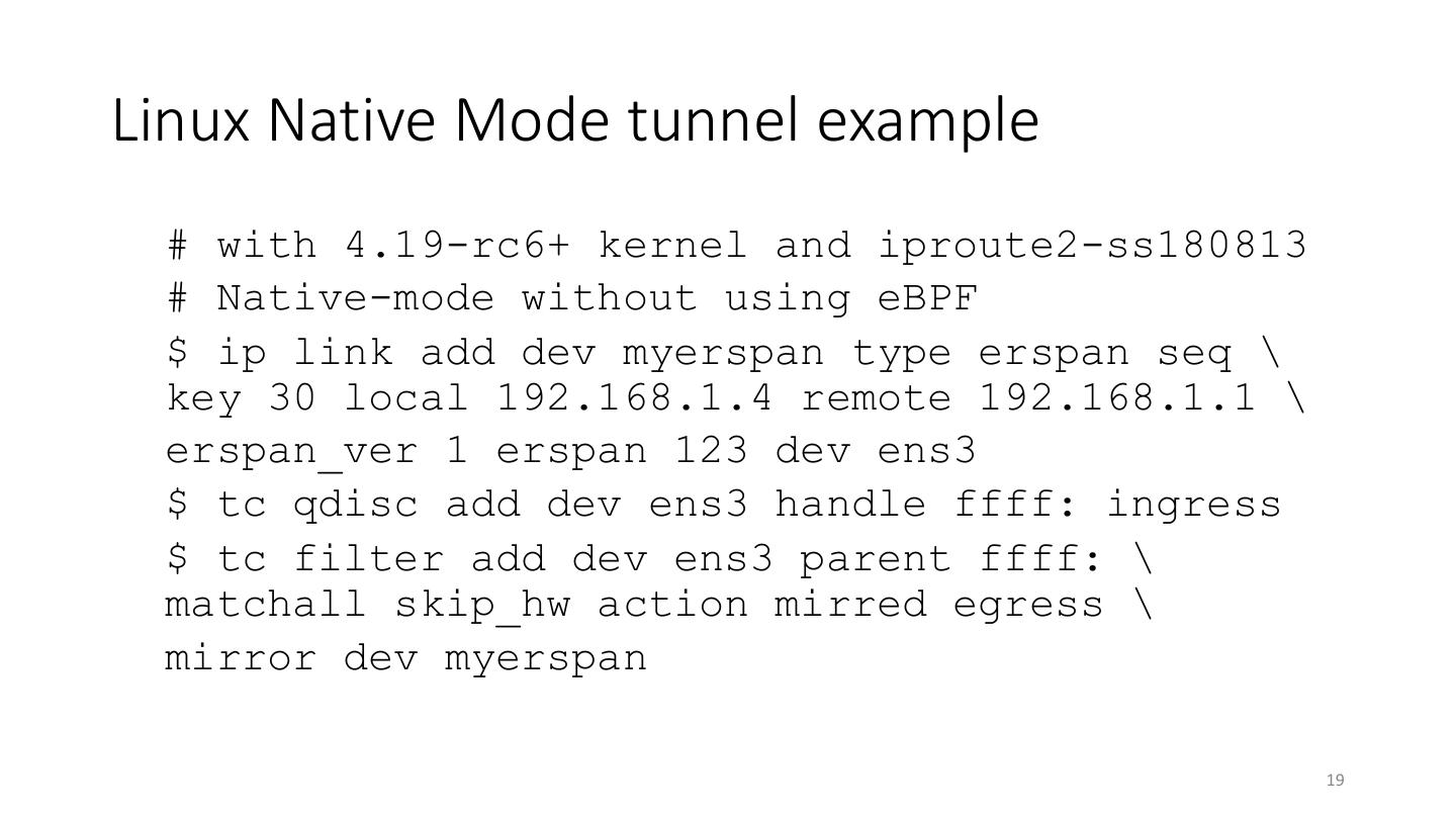 19 .Linux Native Mode tunnel example # with 4.19-rc6+ kernel and iproute2-ss180813 # Native-mode without using eBPF $ ip link add dev myerspan type erspan seq \ key 30 local 192.168.1.4 remote 192.168.1.1 \ erspan_ver 1 erspan 123 dev ens3 $ tc qdisc add dev ens3 handle ffff: ingress $ tc filter add dev ens3 parent ffff: \ matchall skip_hw action mirred egress \ mirror dev myerspan 19