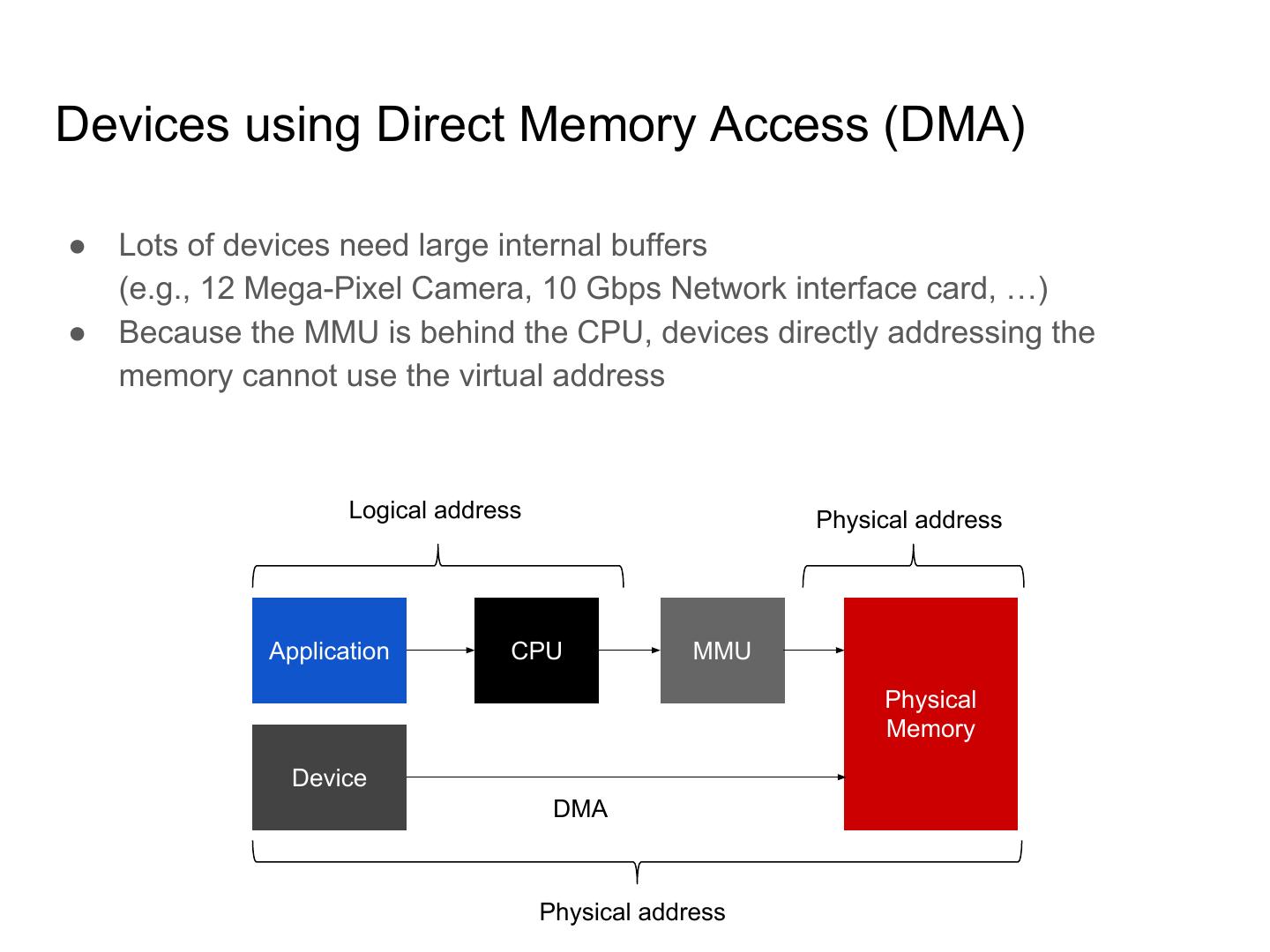 7 .Devices using Direct Memory Access (DMA) ● Lots of devices need large internal buffers (e.g., 12 Mega-Pixel Camera, 10 Gbps Network interface card, …) ● Because the MMU is behind the CPU, devices directly addressing the memory cannot use the virtual address Logical address Physical address Application CPU MMU Physical Memory Device DMA Physical address