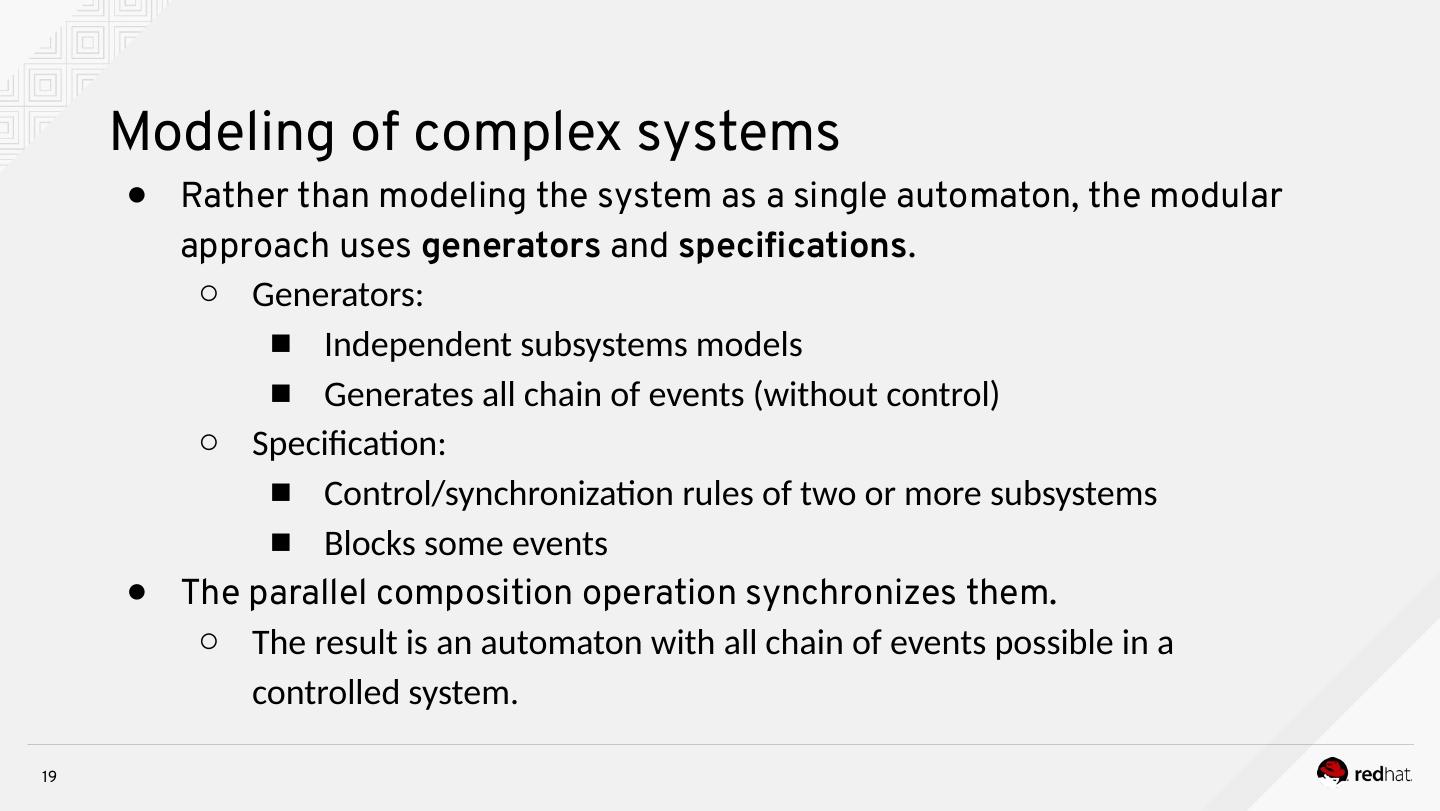 19 . Modeling of complex systems ● Rather than modeling the system as a single automaton, the modular approach uses generators and specifications. ○ Generators: ■ Independent subsystems models ■ Generates all chain of events (without control) ○ Specification: ■ Control/synchronization rules of two or more subsystems ■ Blocks some events ● The parallel composition operation synchronizes them. ○ The result is an automaton with all chain of events possible in a controlled system. 19