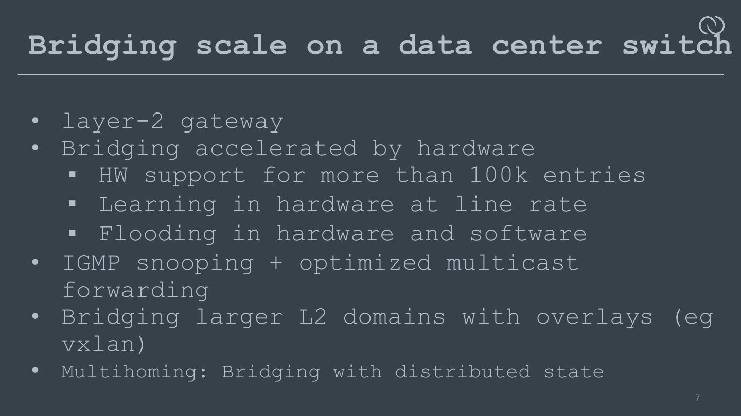 7 .Bridging scale on a data center switch • layer-2 gateway • Bridging accelerated by hardware ▪ HW support for more than 100k entries ▪ Learning in hardware at line rate ▪ Flooding in hardware and software • IGMP snooping + optimized multicast forwarding • Bridging larger L2 domains with overlays (eg vxlan) • Multihoming: Bridging with distributed state 7