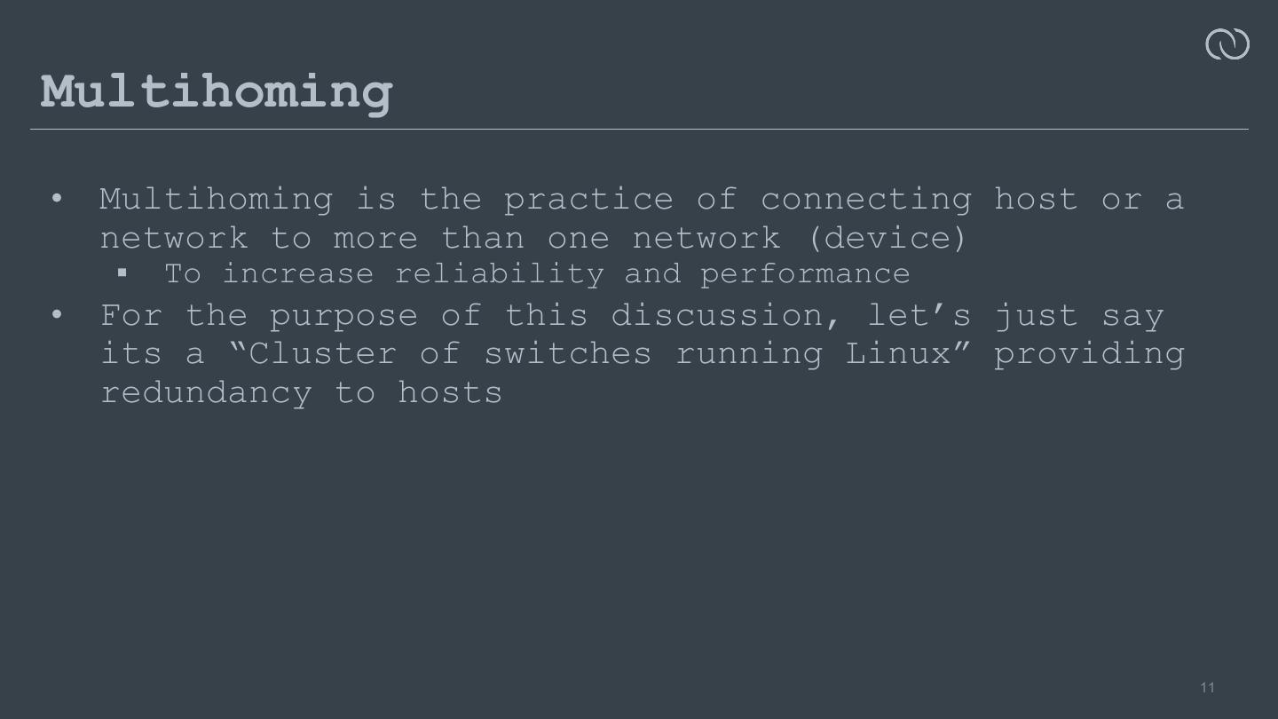 11 .Multihoming • Multihoming is the practice of connecting host or a network to more than one network (device) ▪ To increase reliability and performance • For the purpose of this discussion, let’s just say its a “Cluster of switches running Linux” providing redundancy to hosts 11
