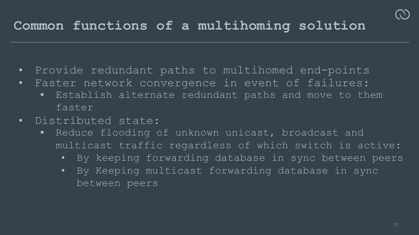 12 .Common functions of a multihoming solution • Provide redundant paths to multihomed end-points • Faster network convergence in event of failures: ▪ Establish alternate redundant paths and move to them faster • Distributed state: ▪ Reduce flooding of unknown unicast, broadcast and multicast traffic regardless of which switch is active: • By keeping forwarding database in sync between peers • By Keeping multicast forwarding database in sync between peers 12