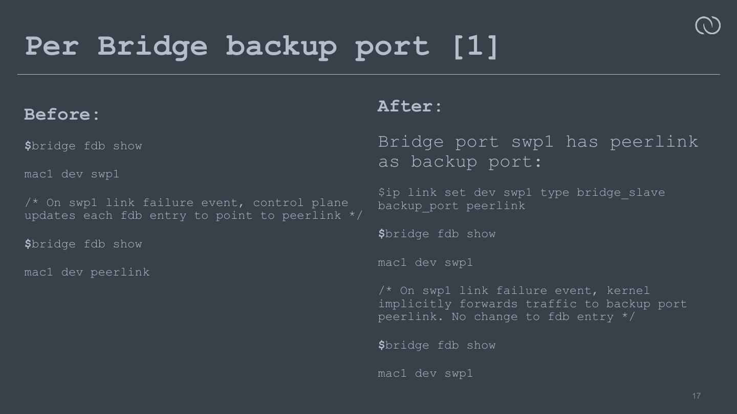 17 .Per Bridge backup port [1] Before: After: $bridge fdb show Bridge port swp1 has peerlink as backup port: mac1 dev swp1 $ip link set dev swp1 type bridge_slave /* On swp1 link failure event, control plane backup_port peerlink updates each fdb entry to point to peerlink */ $bridge fdb show $bridge fdb show mac1 dev swp1 mac1 dev peerlink /* On swp1 link failure event, kernel implicitly forwards traffic to backup port peerlink. No change to fdb entry */ $bridge fdb show mac1 dev swp1 17