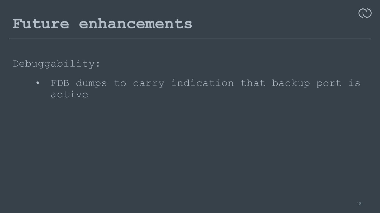 18 .Future enhancements Debuggability: • FDB dumps to carry indication that backup port is active 18