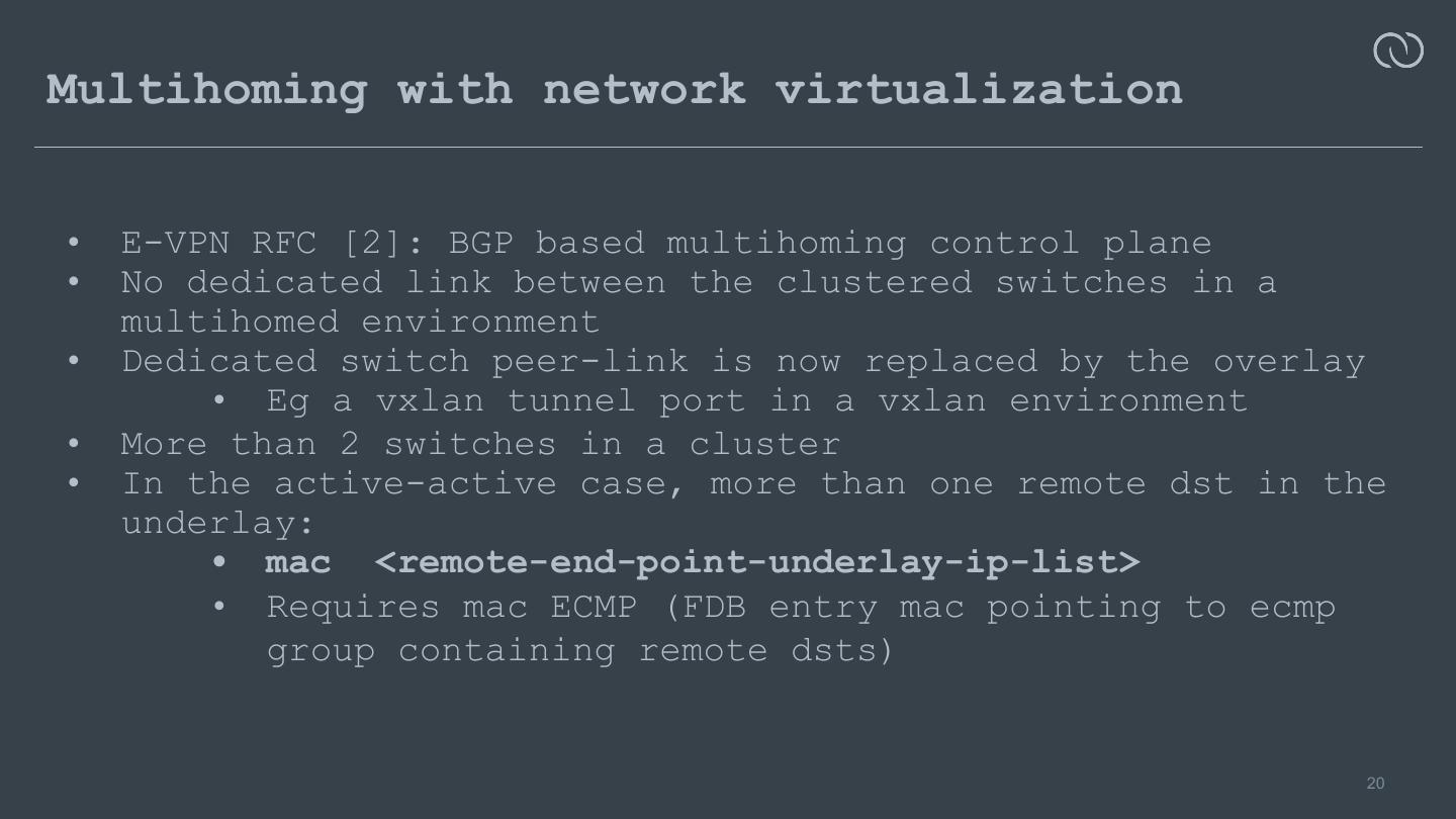 20 .Multihoming with network virtualization • E-VPN RFC [2]: BGP based multihoming control plane • No dedicated link between the clustered switches in a multihomed environment • Dedicated switch peer-link is now replaced by the overlay • Eg a vxlan tunnel port in a vxlan environment • More than 2 switches in a cluster • In the active-active case, more than one remote dst in the underlay: • mac <remote-end-point-underlay-ip-list> • Requires mac ECMP (FDB entry mac pointing to ecmp group containing remote dsts) 20