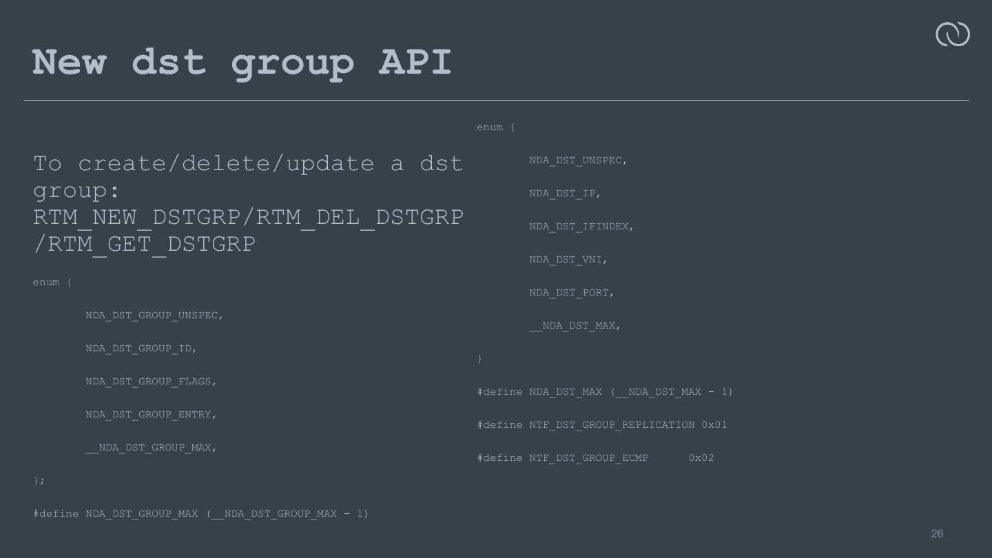 26 .New dst group API enum { To create/delete/update a dst NDA_DST_UNSPEC, group: NDA_DST_IP, RTM_NEW_DSTGRP/RTM_DEL_DSTGRP NDA_DST_IFINDEX, /RTM_GET_DSTGRP NDA_DST_VNI, enum { NDA_DST_PORT, NDA_DST_GROUP_UNSPEC, __NDA_DST_MAX, NDA_DST_GROUP_ID, } NDA_DST_GROUP_FLAGS, #define NDA_DST_MAX (__NDA_DST_MAX - 1) NDA_DST_GROUP_ENTRY, #define NTF_DST_GROUP_REPLICATION 0x01 __NDA_DST_GROUP_MAX, #define NTF_DST_GROUP_ECMP 0x02 }; #define NDA_DST_GROUP_MAX (__NDA_DST_GROUP_MAX - 1) 26