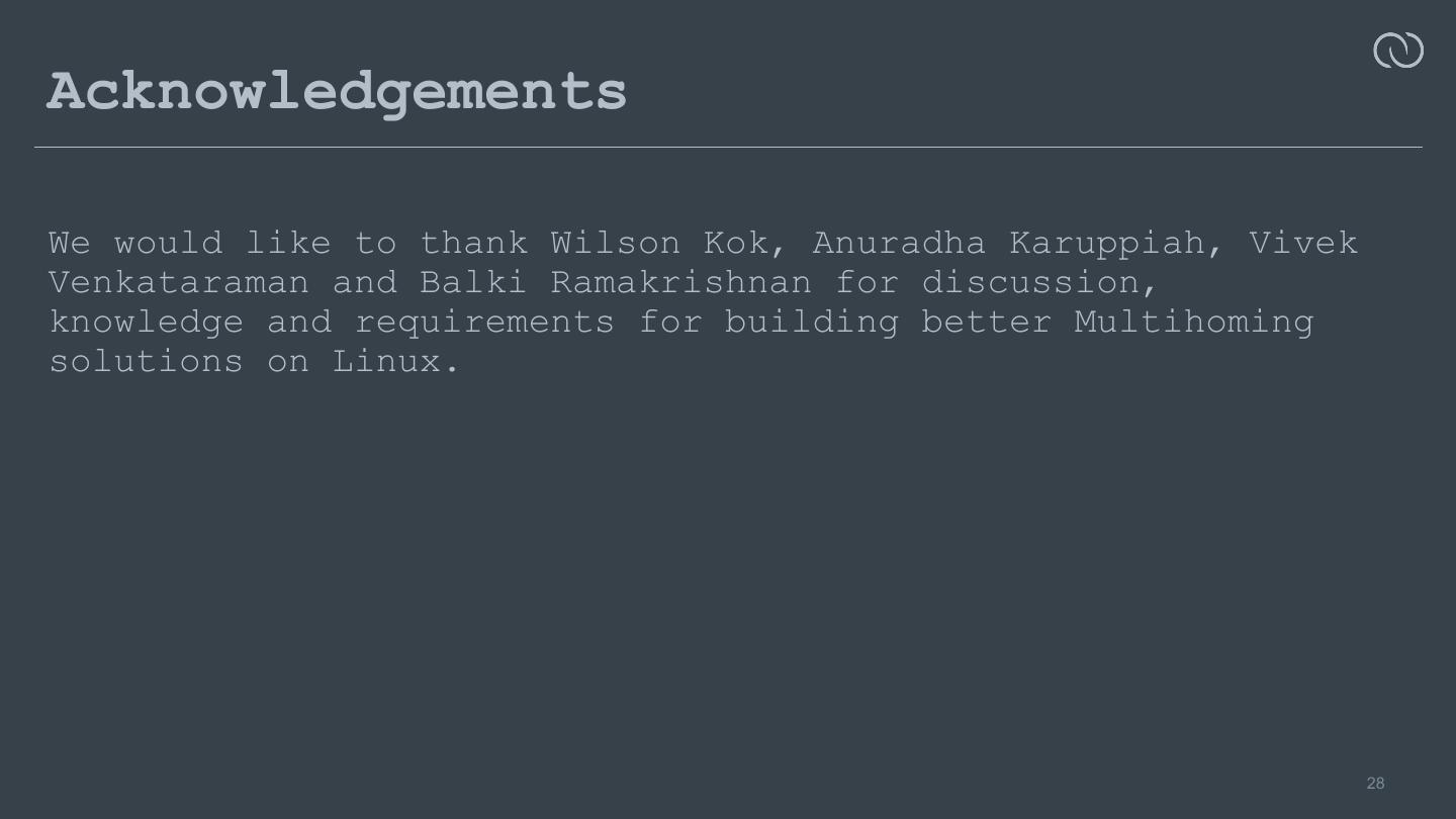 28 .Acknowledgements We would like to thank Wilson Kok, Anuradha Karuppiah, Vivek Venkataraman and Balki Ramakrishnan for discussion, knowledge and requirements for building better Multihoming solutions on Linux. 28