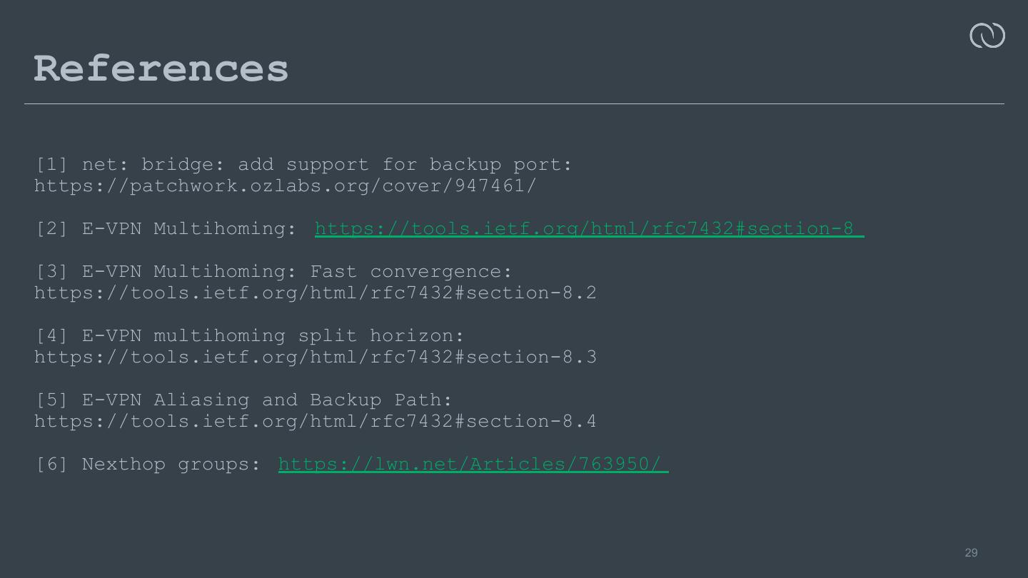 29 .References [1] net: bridge: add support for backup port: https://patchwork.ozlabs.org/cover/947461/ [2] E-VPN Multihoming: https://tools.ietf.org/html/rfc7432#section-8 [3] E-VPN Multihoming: Fast convergence: https://tools.ietf.org/html/rfc7432#section-8.2 [4] E-VPN multihoming split horizon: https://tools.ietf.org/html/rfc7432#section-8.3 [5] E-VPN Aliasing and Backup Path: https://tools.ietf.org/html/rfc7432#section-8.4 [6] Nexthop groups: https://lwn.net/Articles/763950/ 29