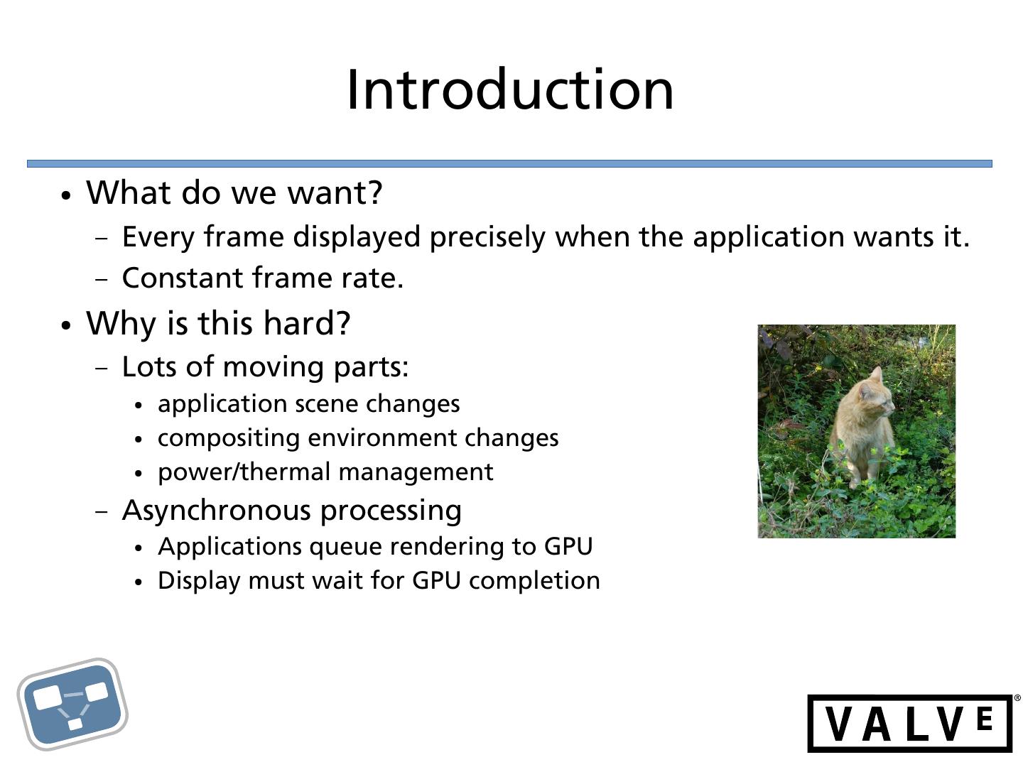 2 . Introduction ● What do we want? – Every frame displayed precisely when the application wants it. – Constant frame rate. ● Why is this hard? – Lots of moving parts: ● application scene changes ● compositing environment changes ● power/thermal management – Asynchronous processing ● Applications queue rendering to GPU ● Display must wait for GPU completion
