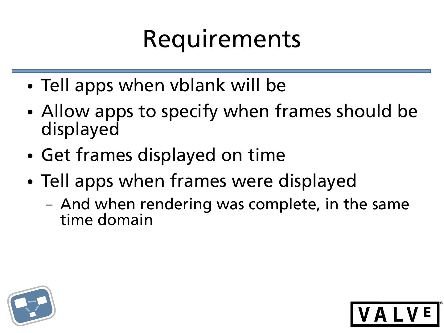 7 . Requirements ● Tell apps when vblank will be ● Allow apps to specify when frames should be displayed ● Get frames displayed on time ● Tell apps when frames were displayed – And when rendering was complete, in the same time domain