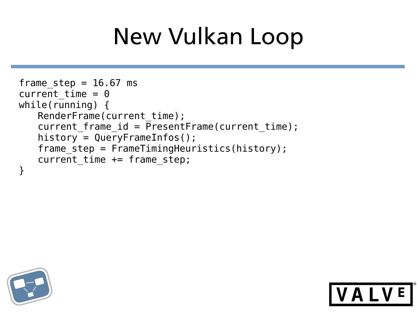 11 . New Vulkan Loop frame_step = 16.67 ms current_time = 0 while(running) { RenderFrame(current_time); current_frame_id = PresentFrame(current_time); history = QueryFrameInfos(); frame_step = FrameTimingHeuristics(history); current_time += frame_step; }