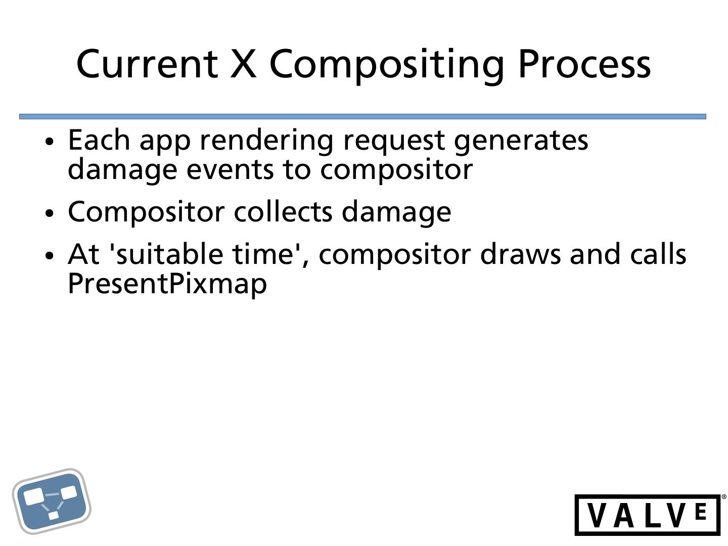 17 . Current X Compositing Process ● Each app rendering request generates damage events to compositor ● Compositor collects damage ● At 'suitable time', compositor draws and calls PresentPixmap