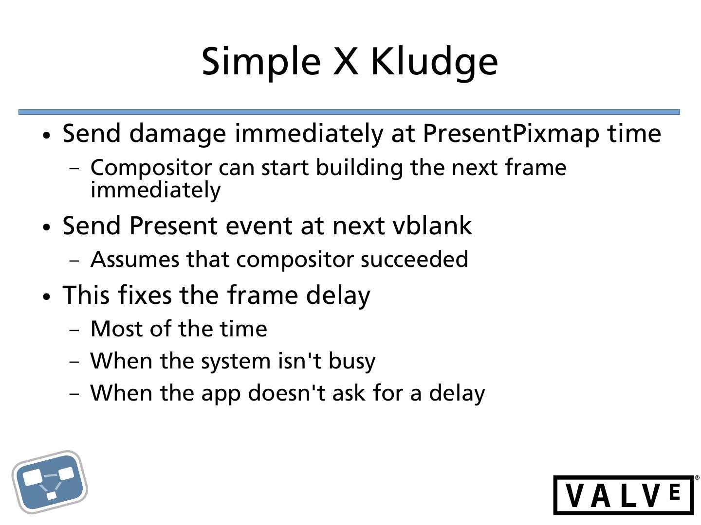 18 . Simple X Kludge ● Send damage immediately at PresentPixmap time – Compositor can start building the next frame immediately ● Send Present event at next vblank – Assumes that compositor succeeded ● This fixes the frame delay – Most of the time – When the system isn't busy – When the app doesn't ask for a delay