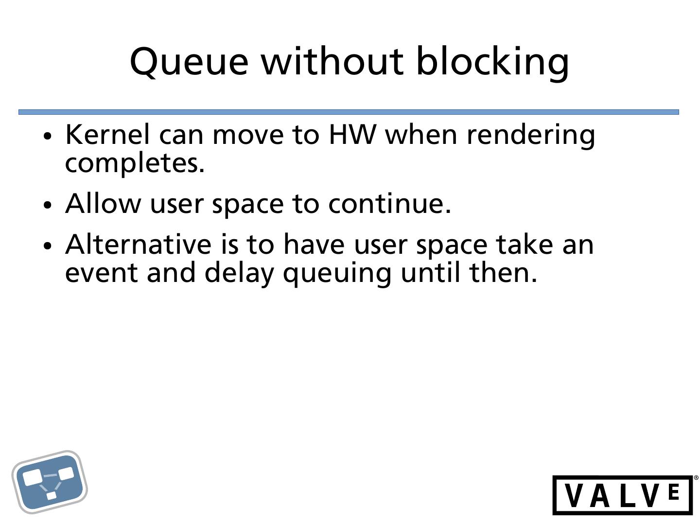 23 . Queue without blocking ● Kernel can move to HW when rendering completes. ● Allow user space to continue. ● Alternative is to have user space take an event and delay queuing until then.